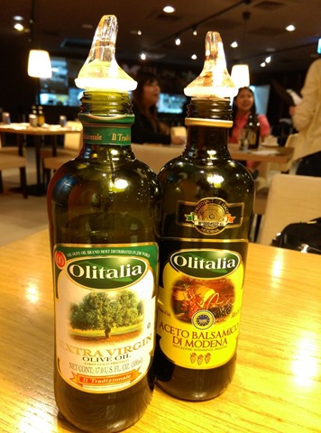 這裡是義大利餐廳 桌上放了兩瓶橄欖油