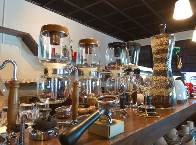 在櫃檯放了不小的虹吸式咖啡壺 早期喝咖啡都是用這個