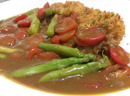 我點了厚切豬排的咖哩 又點了蘆筍跟番茄