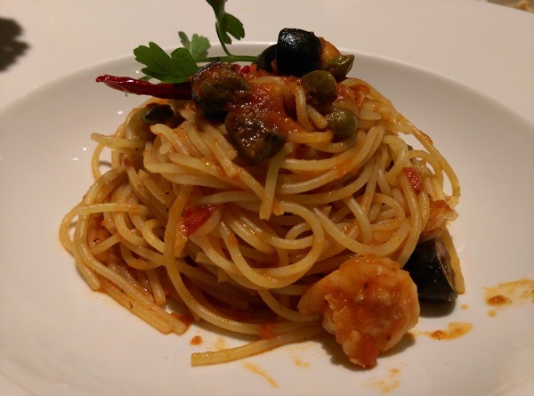 紅醬義大利麵 裡面有鯷魚、大蒜、蝦子跟黑橄欖的搭配