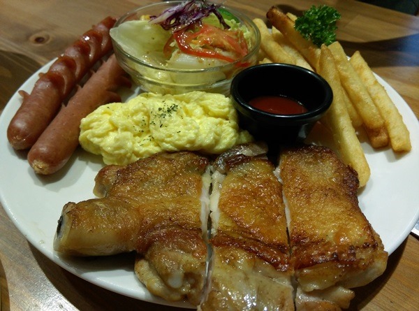 有香腸炒蛋生菜沙拉薯條跟好大片雞肉    雖然是早午餐但這樣的組合真的可以吃很飽
