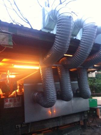 現在店家門口已經用鋁箔紙搭了幾個大的煙囪 把煙引到屋頂上去排放