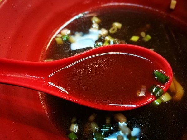 這天來點的是最基本款的牛肉麵 紅色的塑膠碗端上來 淡淡的香氣