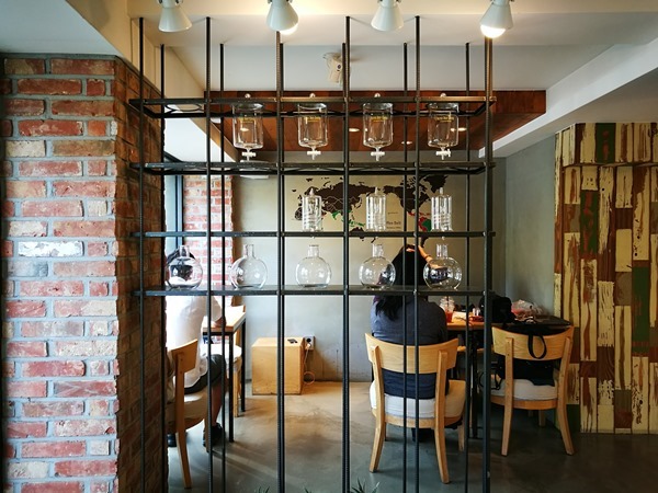 用了咖啡壺做簡單的隔間 跟紅磚牆竟然這麼地搭