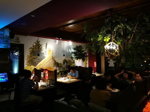 不過位置跟位置間的隔板很高增加了隱私 室內有假樹整個空間有置身戶外晚上野餐的氛圍