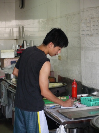 老闆的小孩也在一旁邊忙    偶爾幫忙煎一下蛋餅