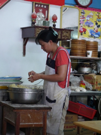 現在已經換了新生代了啊 他在負責炒水煎包的內餡 一旁還有師傅在叮嚀著