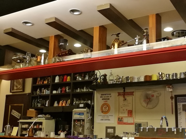 牆上架子上有很多老闆的收藏 大部分都跟咖啡有關少數是茶具