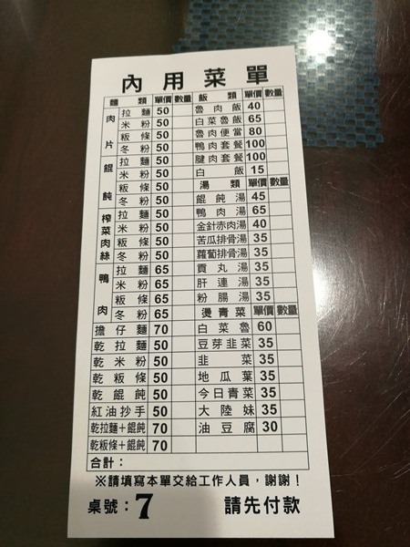 菜單就放在桌上 請填好後交給櫃檯 吃完再結帳 因為生意好的關係 多少要等一下