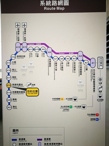 紫色這條是直達車 台北車站到機場第第一/第二航站 中間只停新北產業園區跟長庚醫院