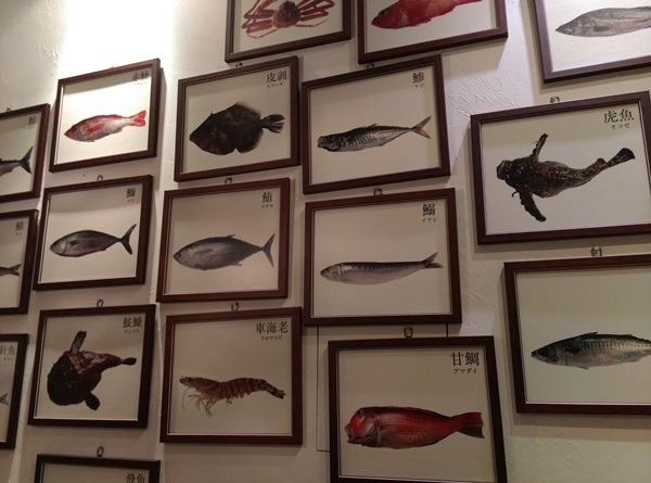 空間很簡單 這牆上掛了各種的魚    備註了各種魚的日文