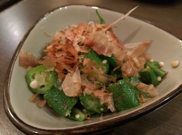 首先上來一小分招待的    川燙的秋葵加上點柴魚片